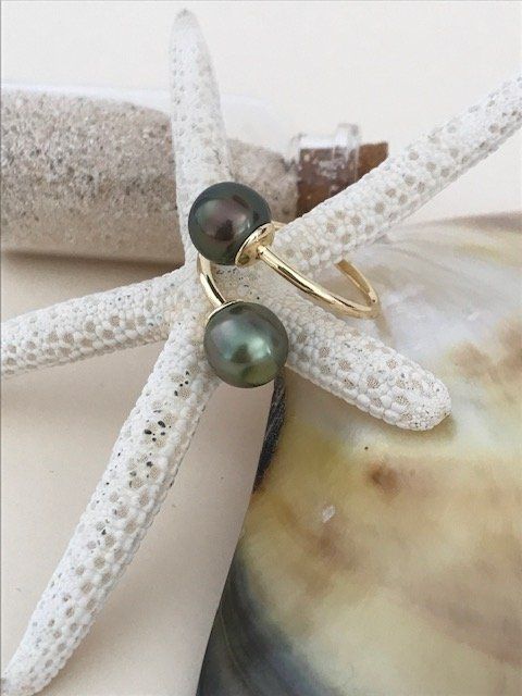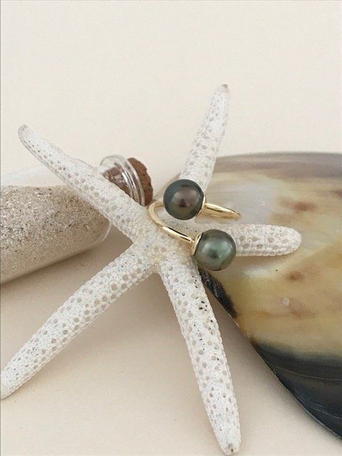 Superbe bague dorée réglable flexible "Toi & Moi" symbole de l'Amour... montée sur une perle de Tahiti de couleur verte et de dimension : 9,4mm et une perle de Tahiti de couleur vert bronze et dimension : 9,5mm