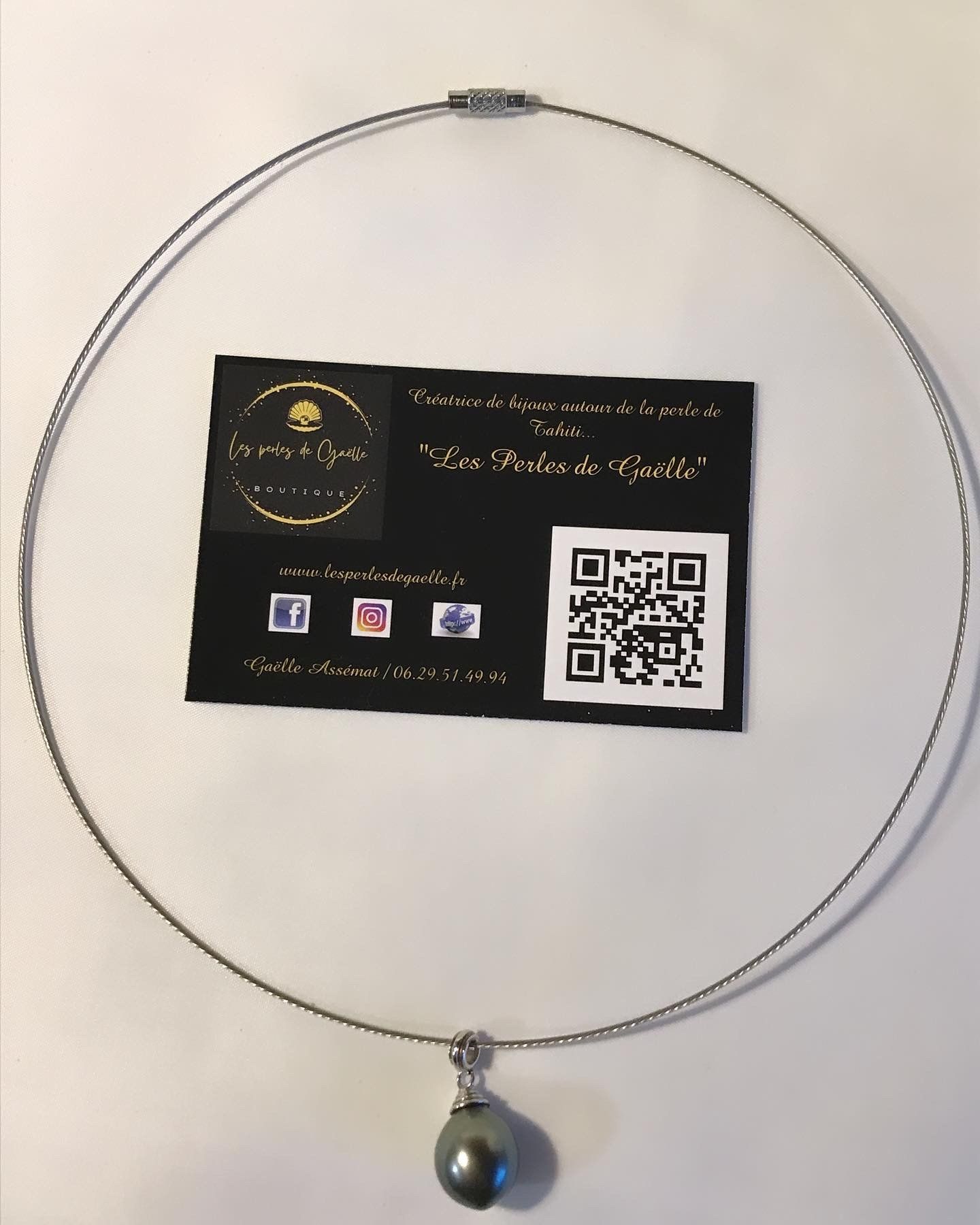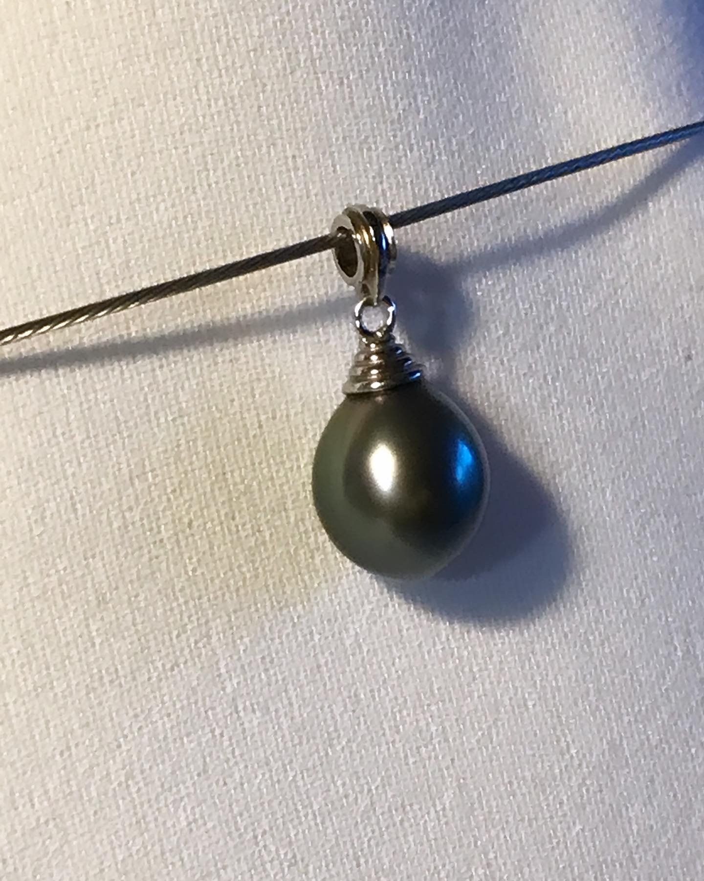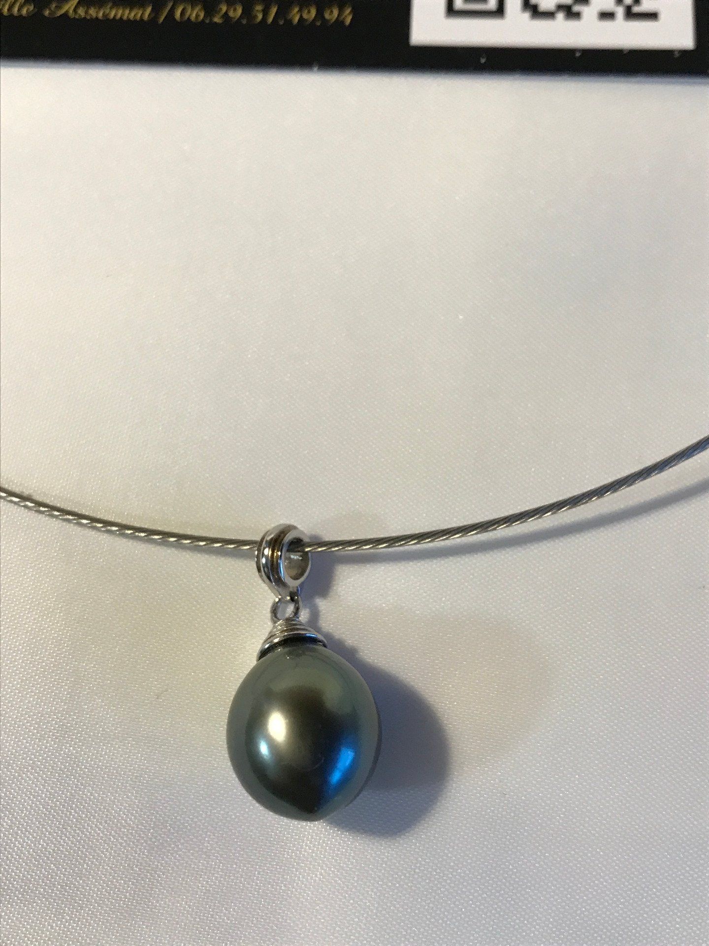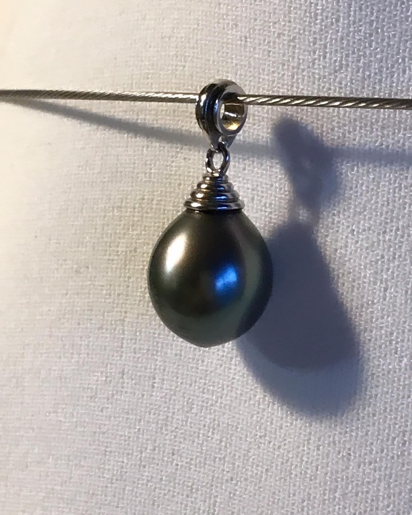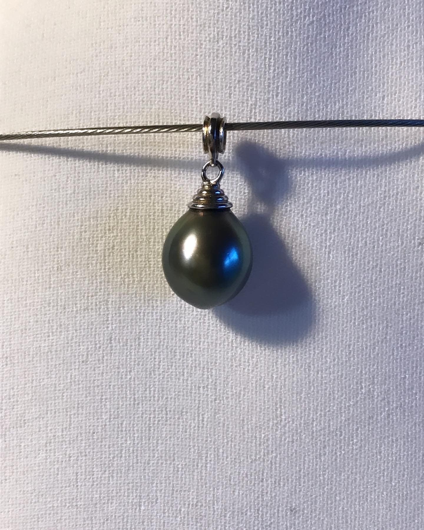 Bélière en argent rhodié avec 1 perle de Tahiti. Dimension perle : 12.1 mm ; Couleur : grise aux reflets vert clair ; Forme : goutte