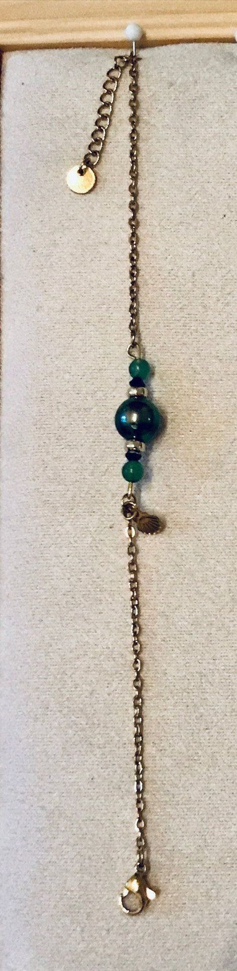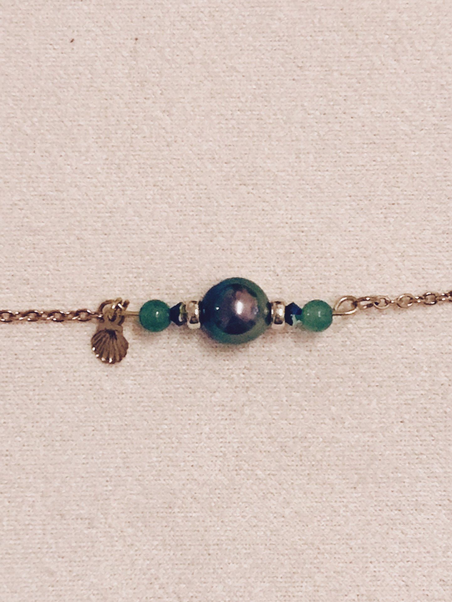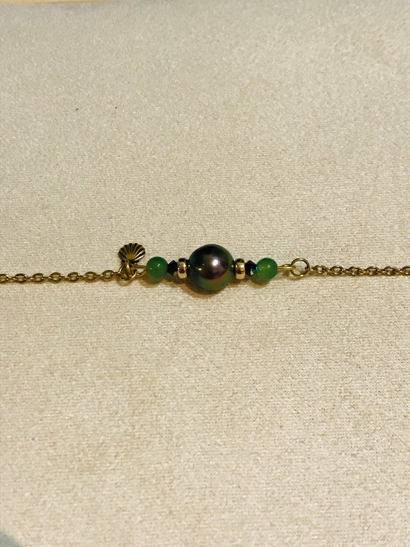 Bracelet en acier inoxydable doré de longueur 18 cm + 3.5cm de chainette de rallonge. Perle de Tahiti de dimension : 9.2 mm. Couleur : verte et aubergine ; Forme : baroque. Ce bracelet fait ressortir le lustre brillant de la perle et sa couleur unique !