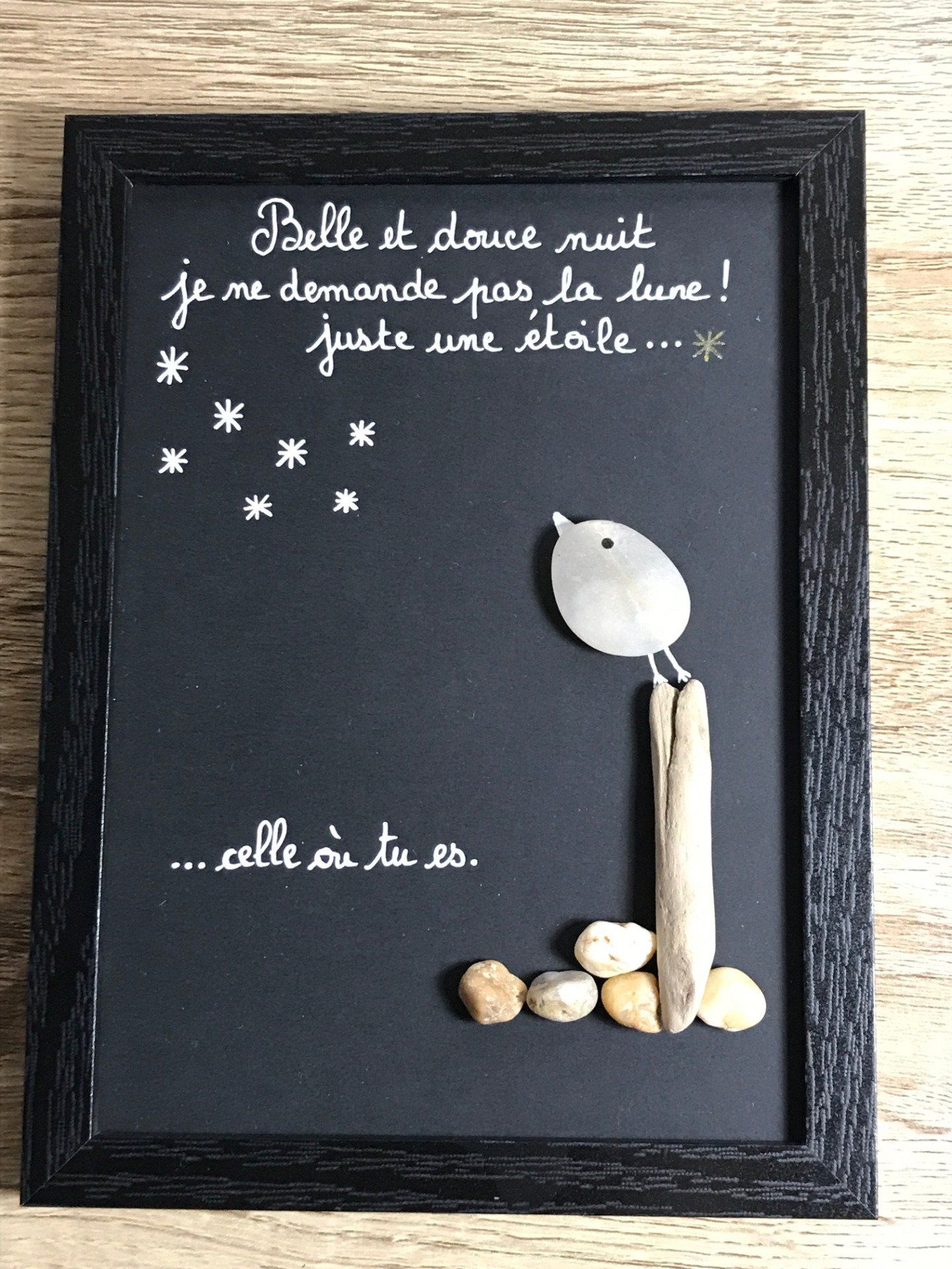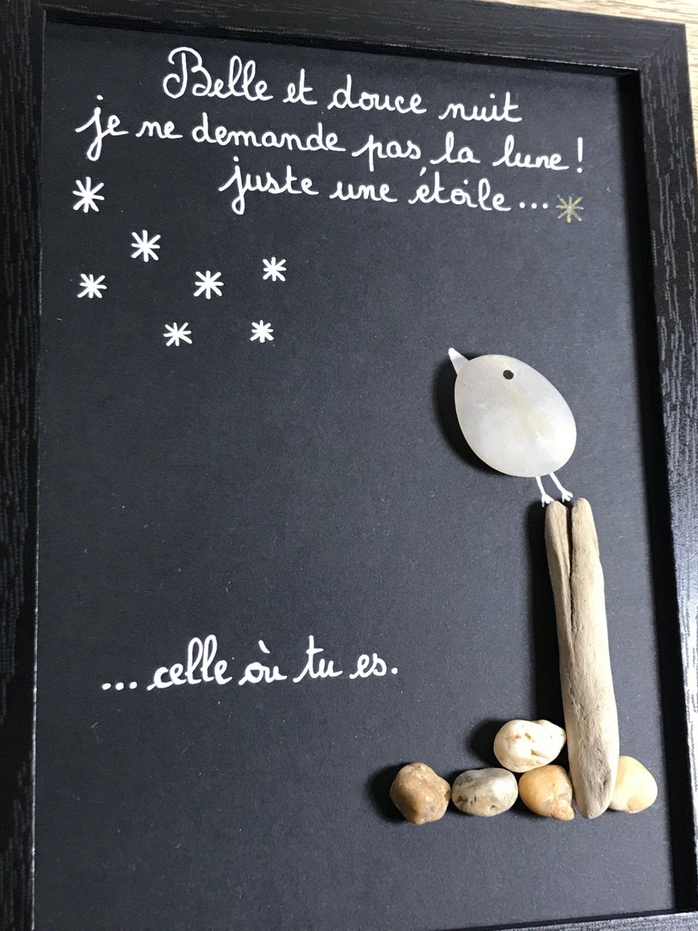 Cadre noir de dimension 15 X 20 cm à accrocher ou poser sur une étagère. Créé à partir de galets et bois flotté agrémenté d'un peu de poésie !