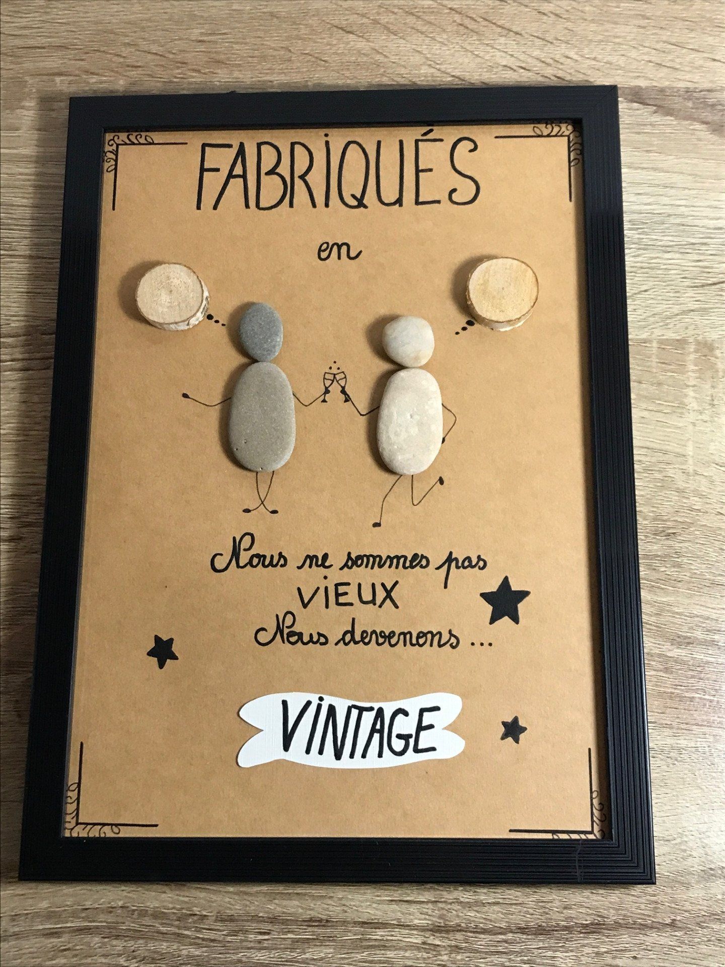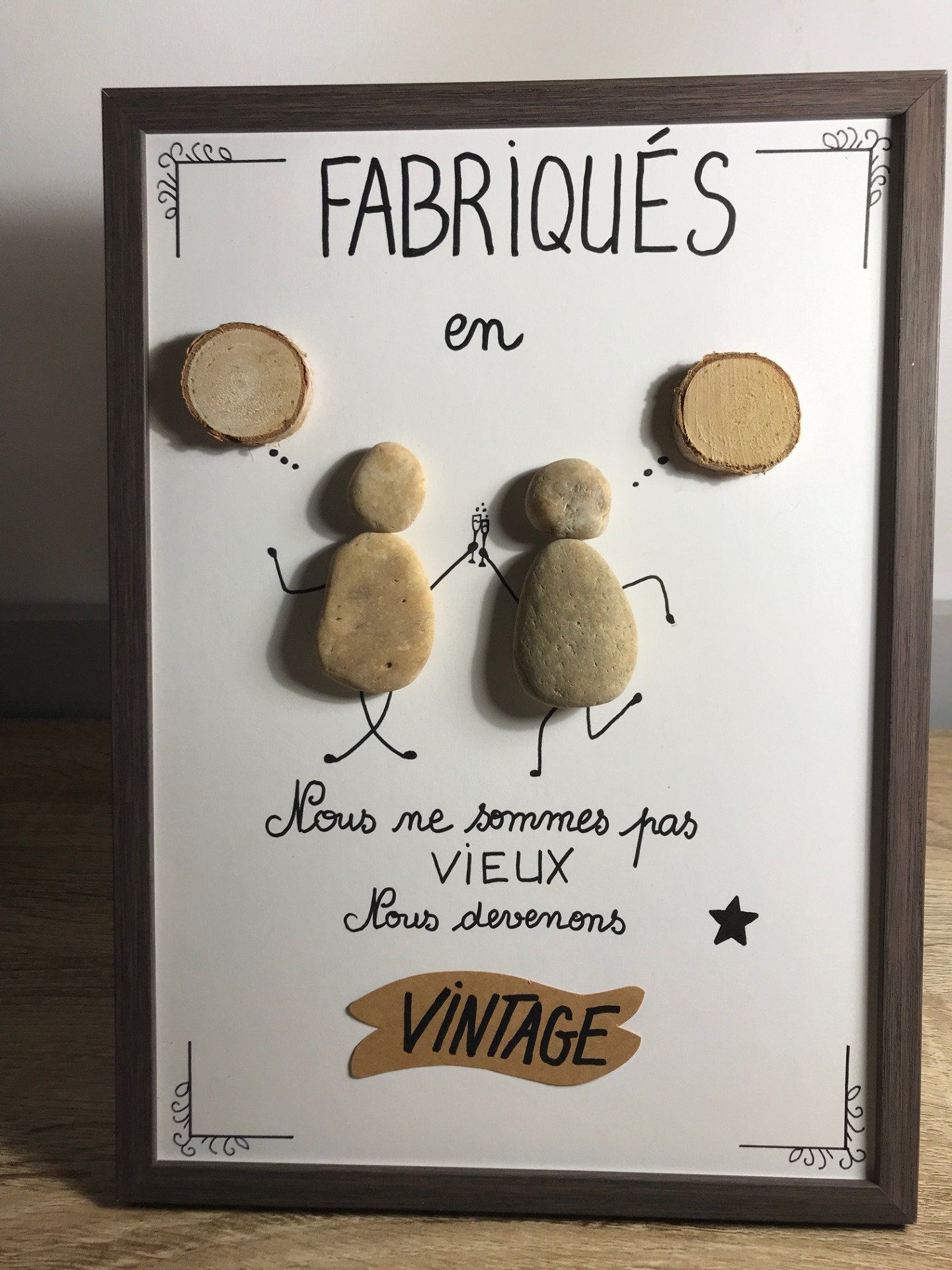 Cadre sur fond blanc ou brun au Choix. Réalisé avec des galets et 2 rondins de bois sur lesquels on ajoute les dates de naissance ! Cadeau d'anniversaire original et personnalisé ! dimension 23 x 31 cm.