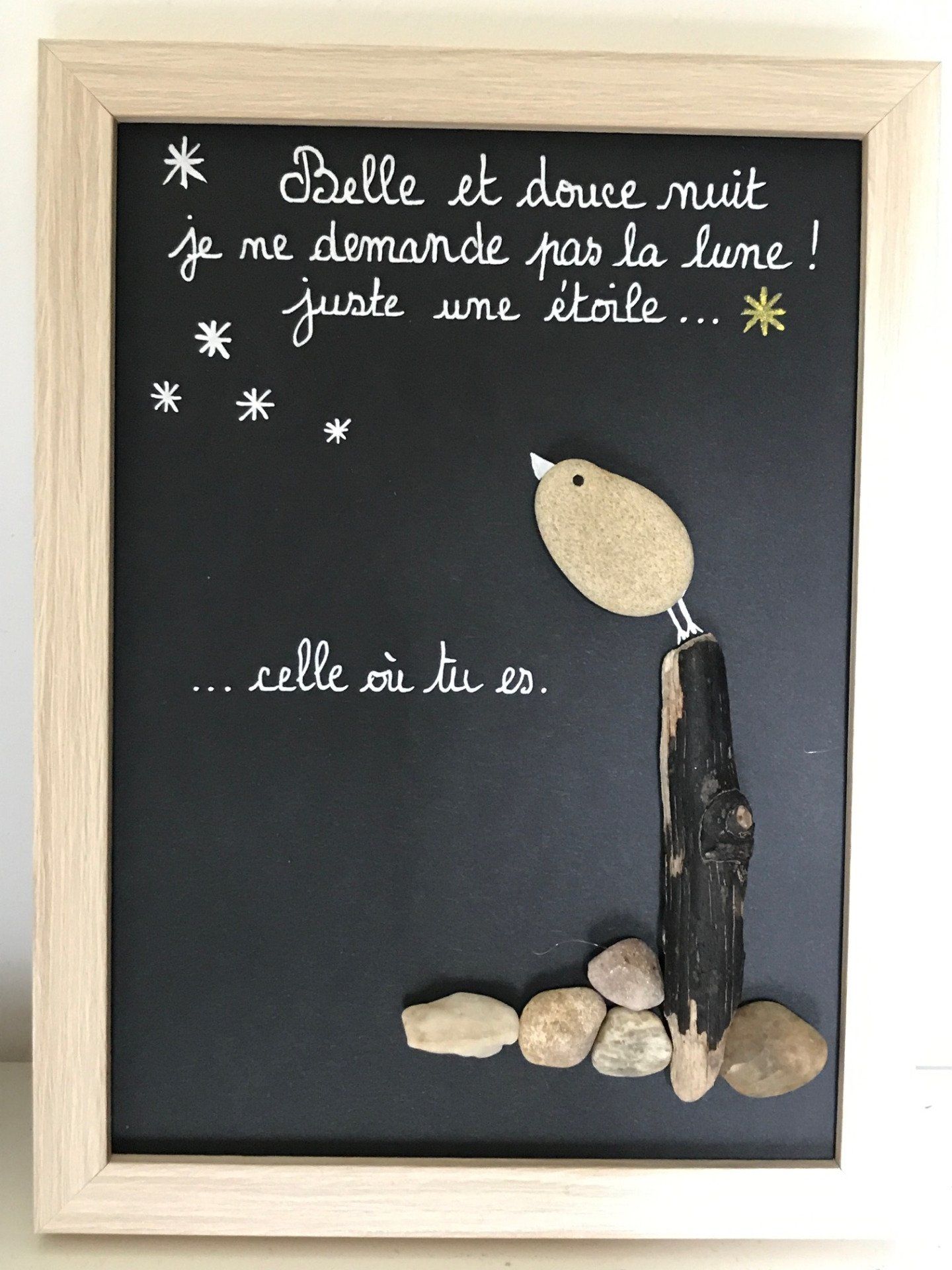 Ce cadre sur fond noir est entièrement imaginé et créé par mes soins avec des galets et du bois flotté depuis mon atelier. Dimension 13x17cm. Demandez votre tableau personnalisé ! chaque tableau est unique de part la forme unique des galets.