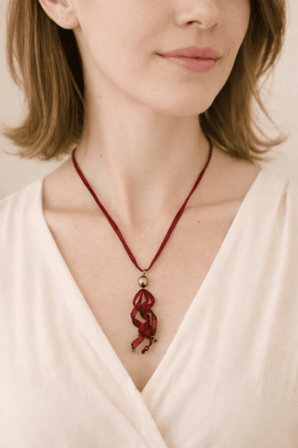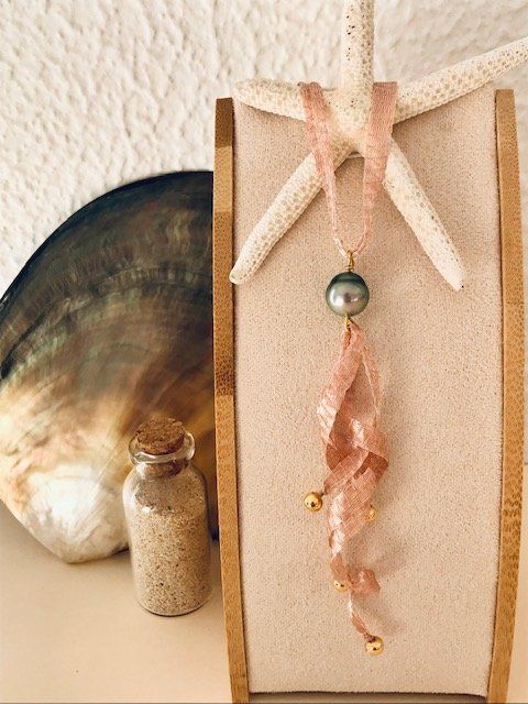 Ce collier signature "Gaëlle" est composé d'un gallon en organza métallisé et 1 perle noire de Tahiti. Longueur collier rouge : 50 cm et ajustable pour les autres couleurs.