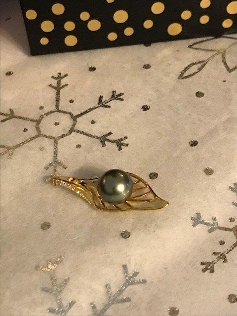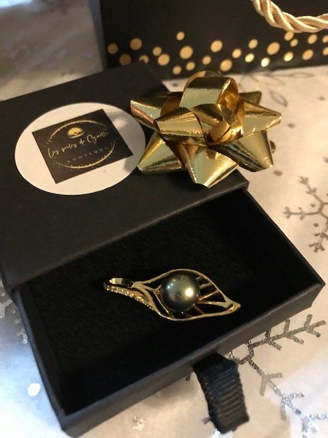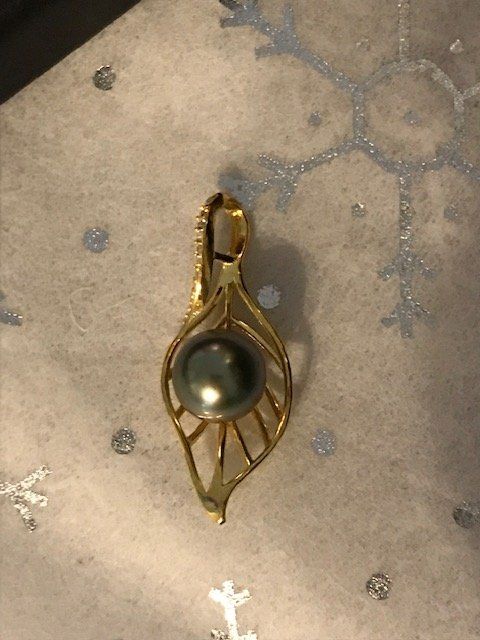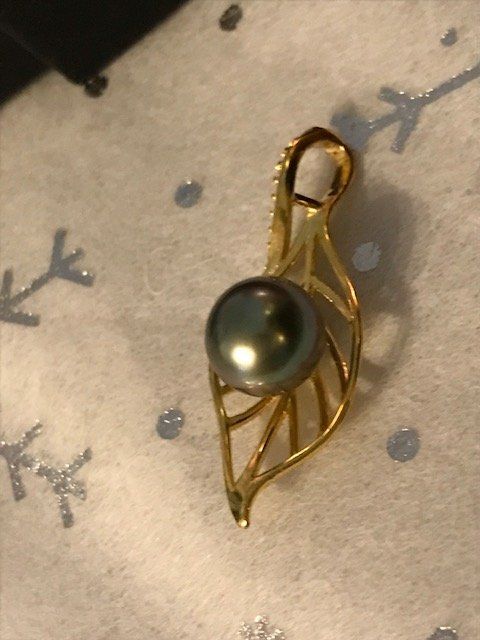 Pendentif en plaqué or et strass mettant en valeur une magnifique perle de Tahiti de couleur verte au lustre très brillant. dimension de la perle : 9.8mm, dimension pendentif 3.5cm