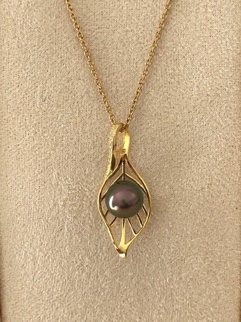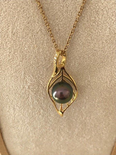 Pendentif en plaqué or et strass mettant en valeur une magnifique perle de Tahiti de couleur verte et aubergine au lustre très brillant. Dimension de la perle : 9.8mm, dimension pendentif 3.5cm