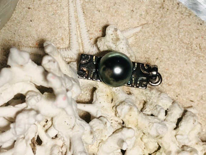 Pendentif "Tiki" en argent rhodié gravé de dimension : 1,8 cm X 0,6 cm. 1 perle noire de Tahiti.