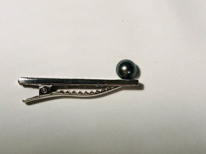 Pince cravate en argent rhodié gravée et montée avec 1 perle noire de Tahiti.