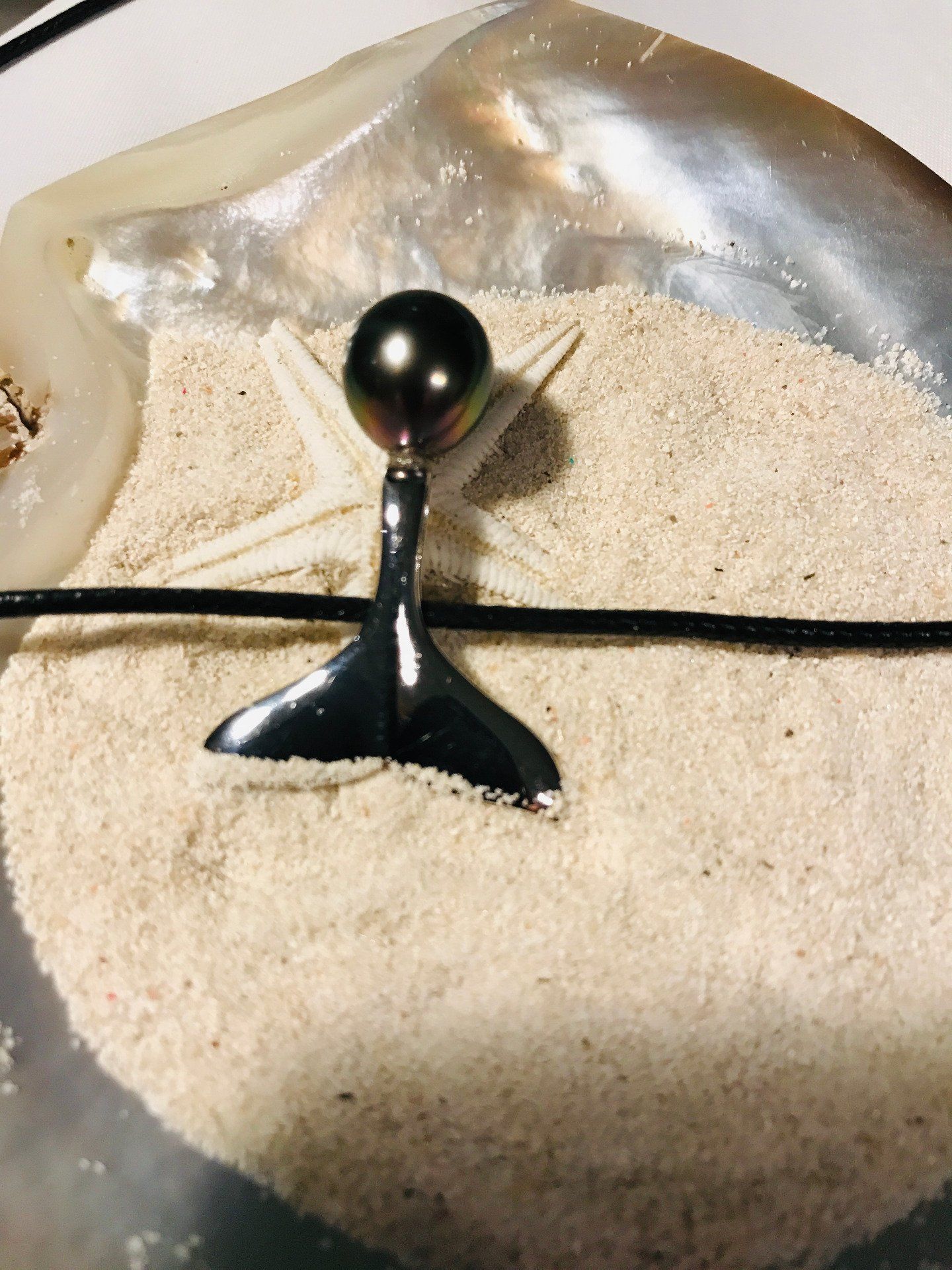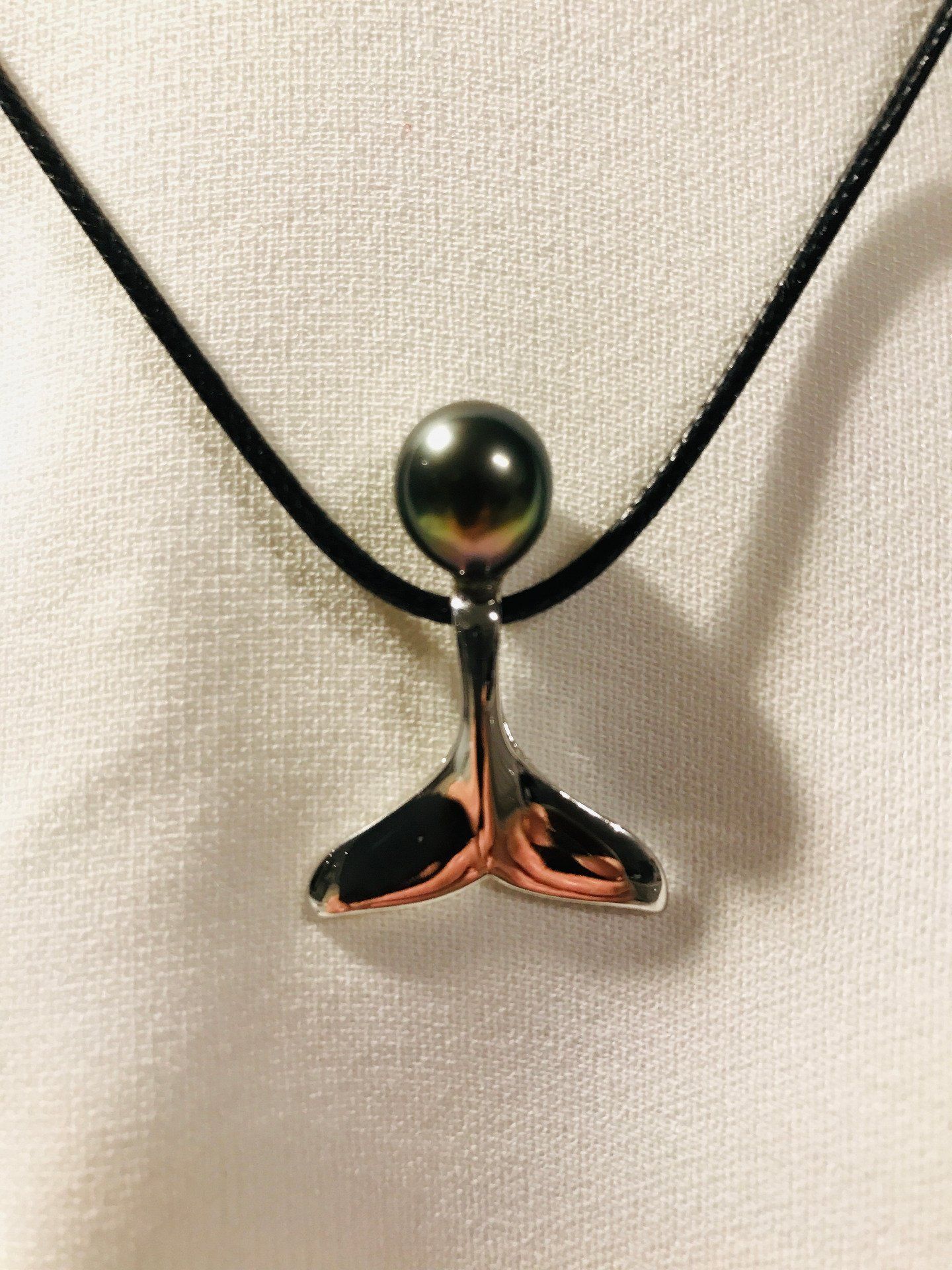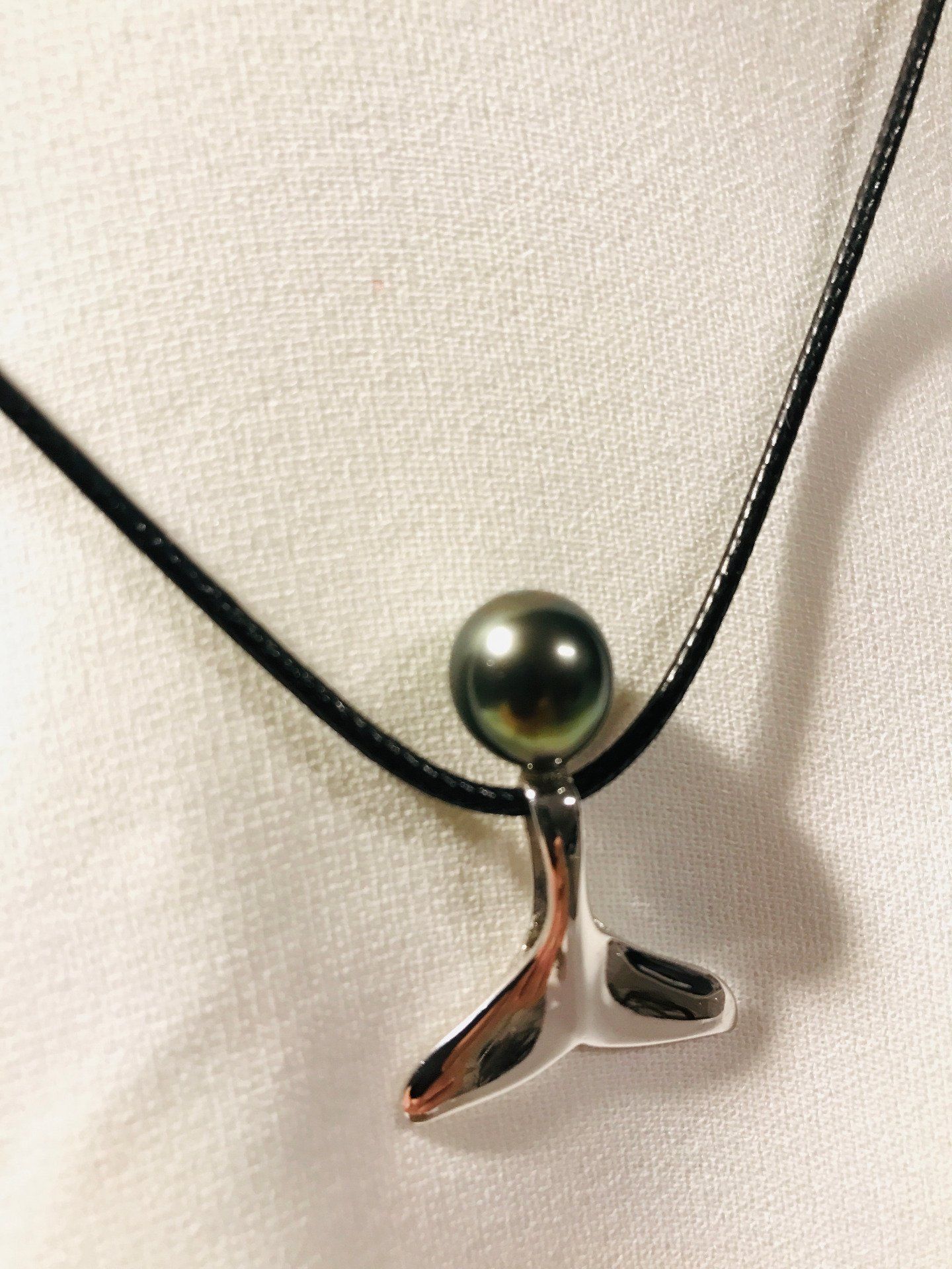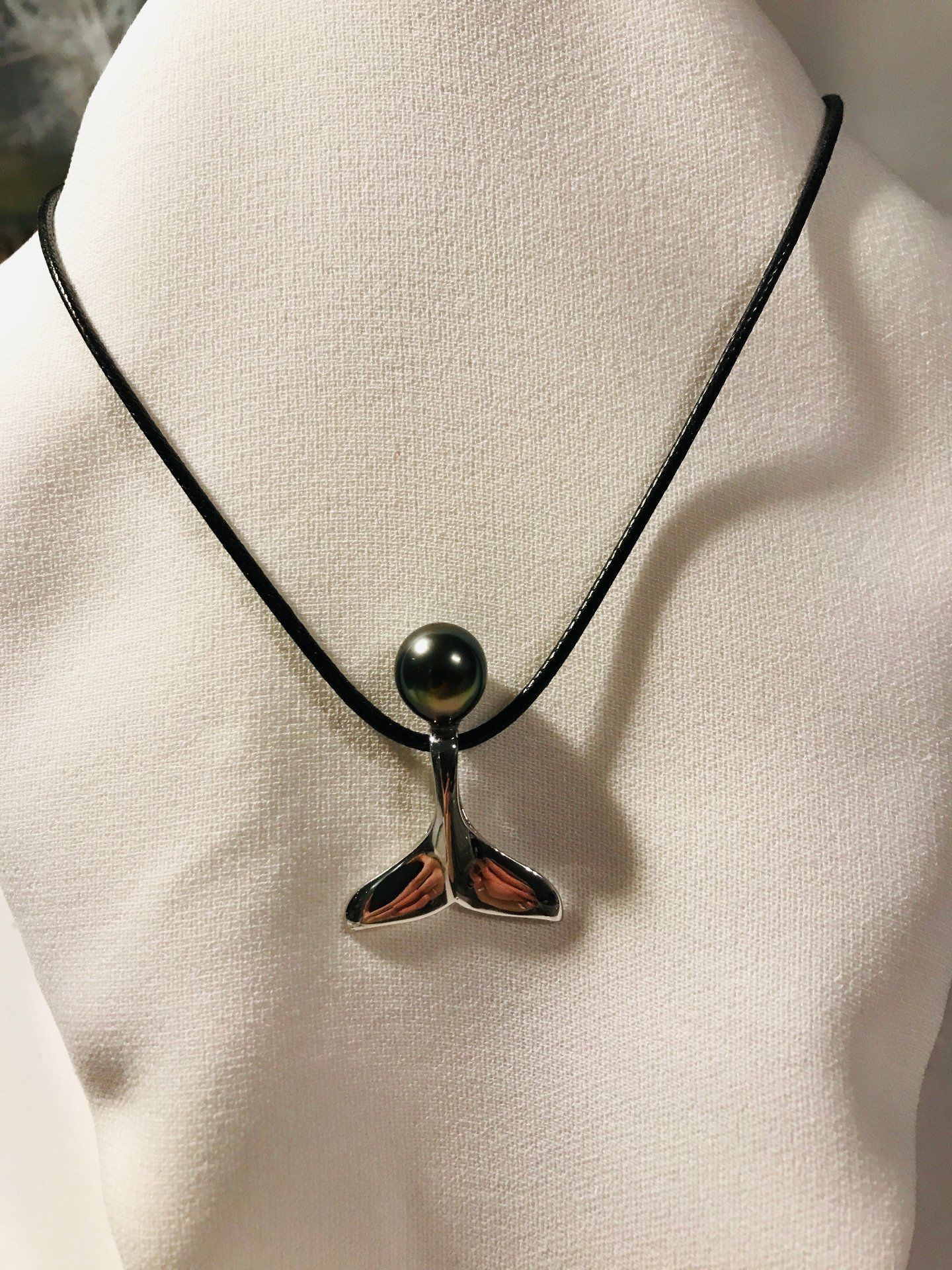 Pendentif "Queue de baleine" en argent rhodié et magnifique perle de Tahiti. Dimension perle 9.5mm ; Couleur : grise aux reflets verts ; forme : ovale