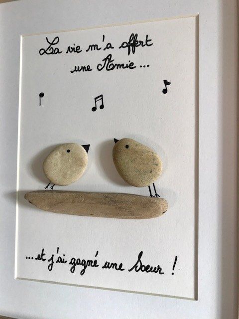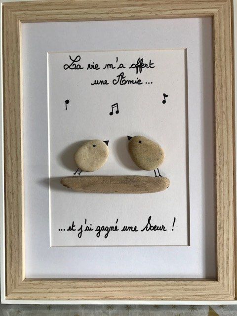 Ce tableau de dimension 18 x 24 cm a été réalisé avec des galets, du bois flotté et beaucoup de poésie pour toutes les amies qui comptent beaucoup !