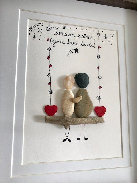 Cadre à suspendre ou poser sur un meuble ou étagère de dimension 18 X 24 m. J'ai réalisé ce tableau avec des galets et du bois flotté. Cadeau idéal pour les amoureux !!!