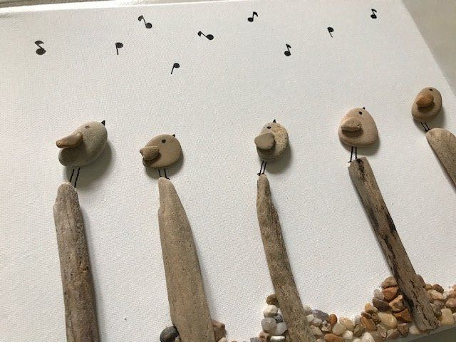 Tableau de galets représentant des mouettes sur bois flotté. Dimension 30X24 cm. Imaginé et réalisé depuis mon atelier, chaque tableau est unique de part la forme du bois et des galets, n'hésitez pas à commander un tableau personnalisé!
